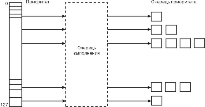 Рис. 2-2. Очередь выполнения. На данном рисунке показано, что нити с более низким значением приоритета, помещаются в очередь выполнения перед нитями с более высоким значением приоритета. Число возможных значений приоритета (от 0 до 127) в точности совпадает с числом очередей выполнения (128).